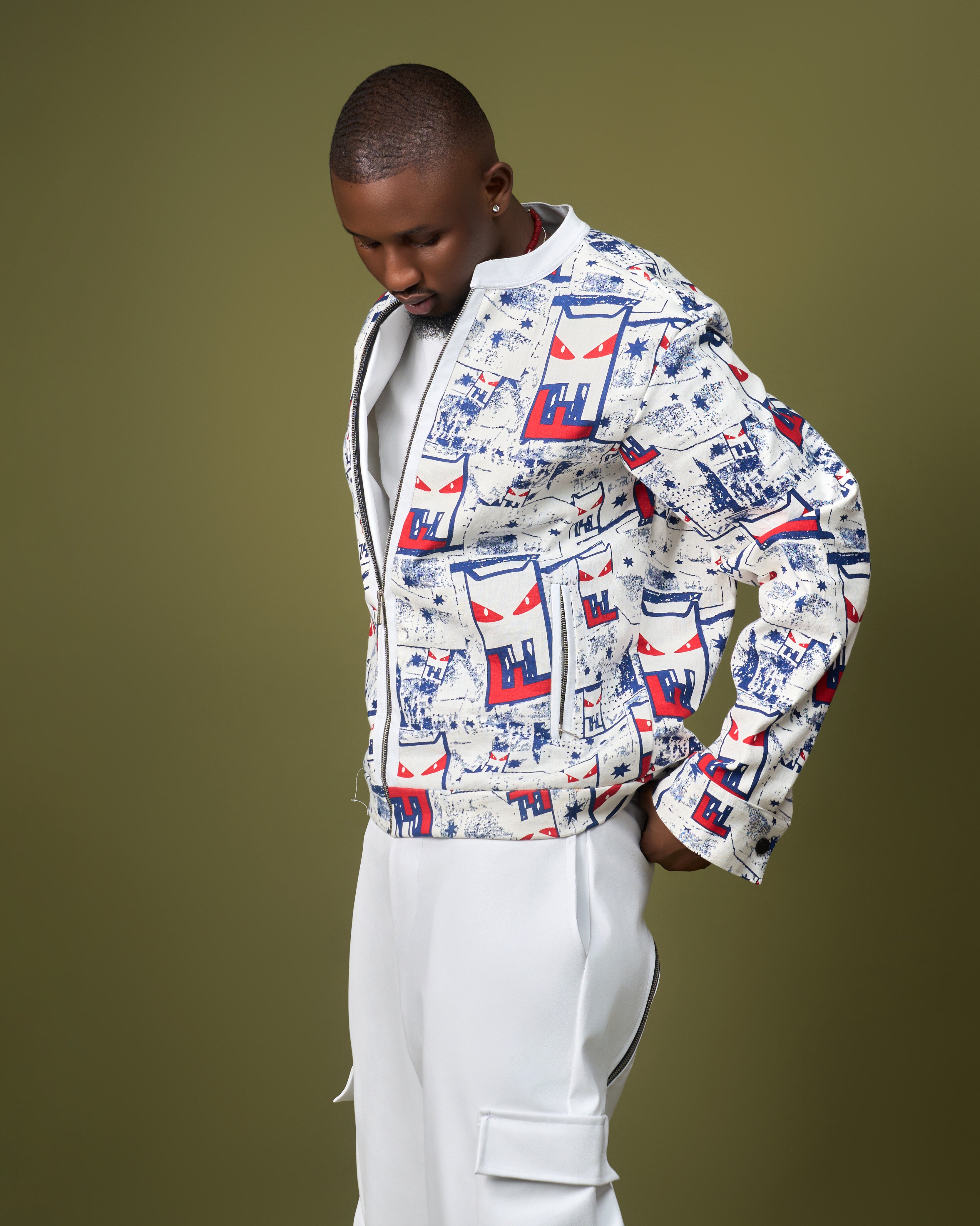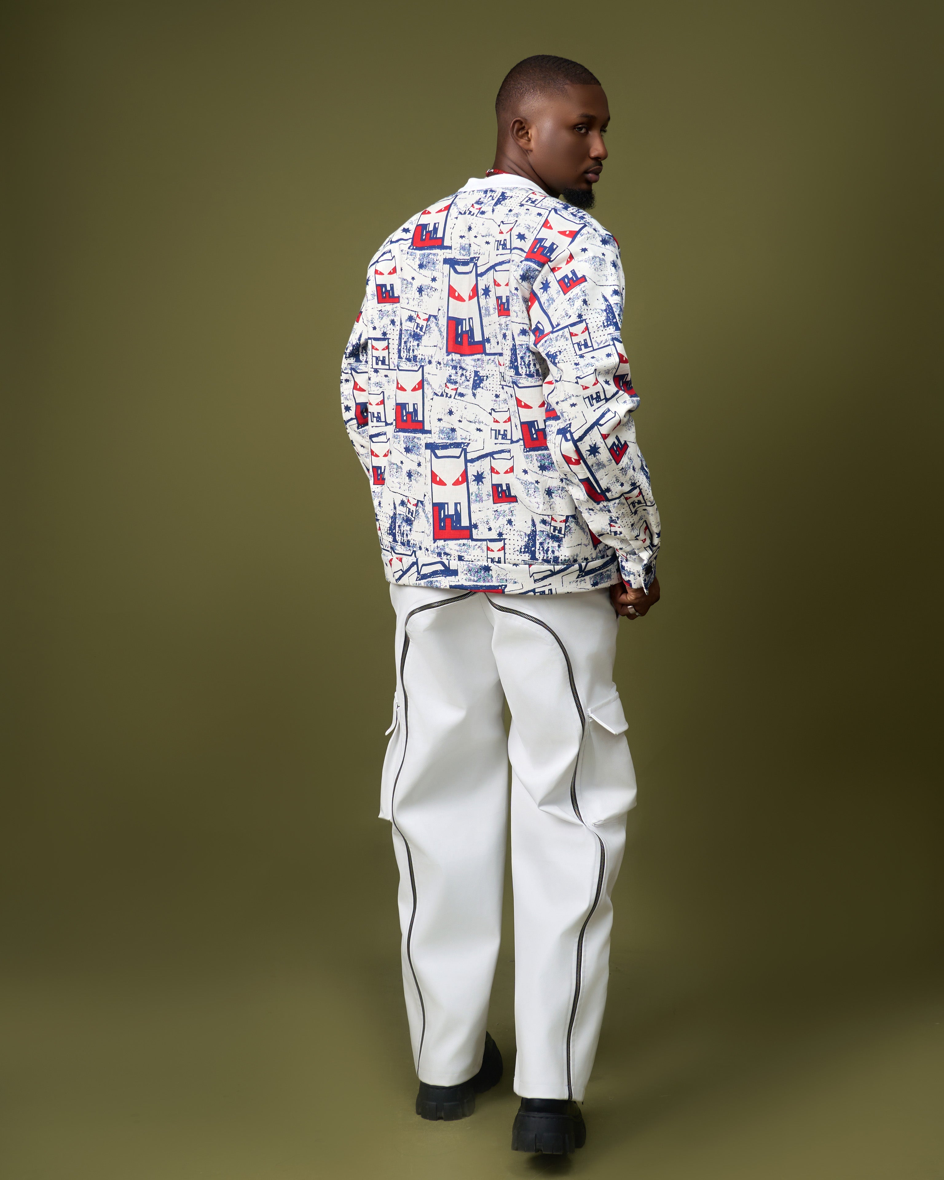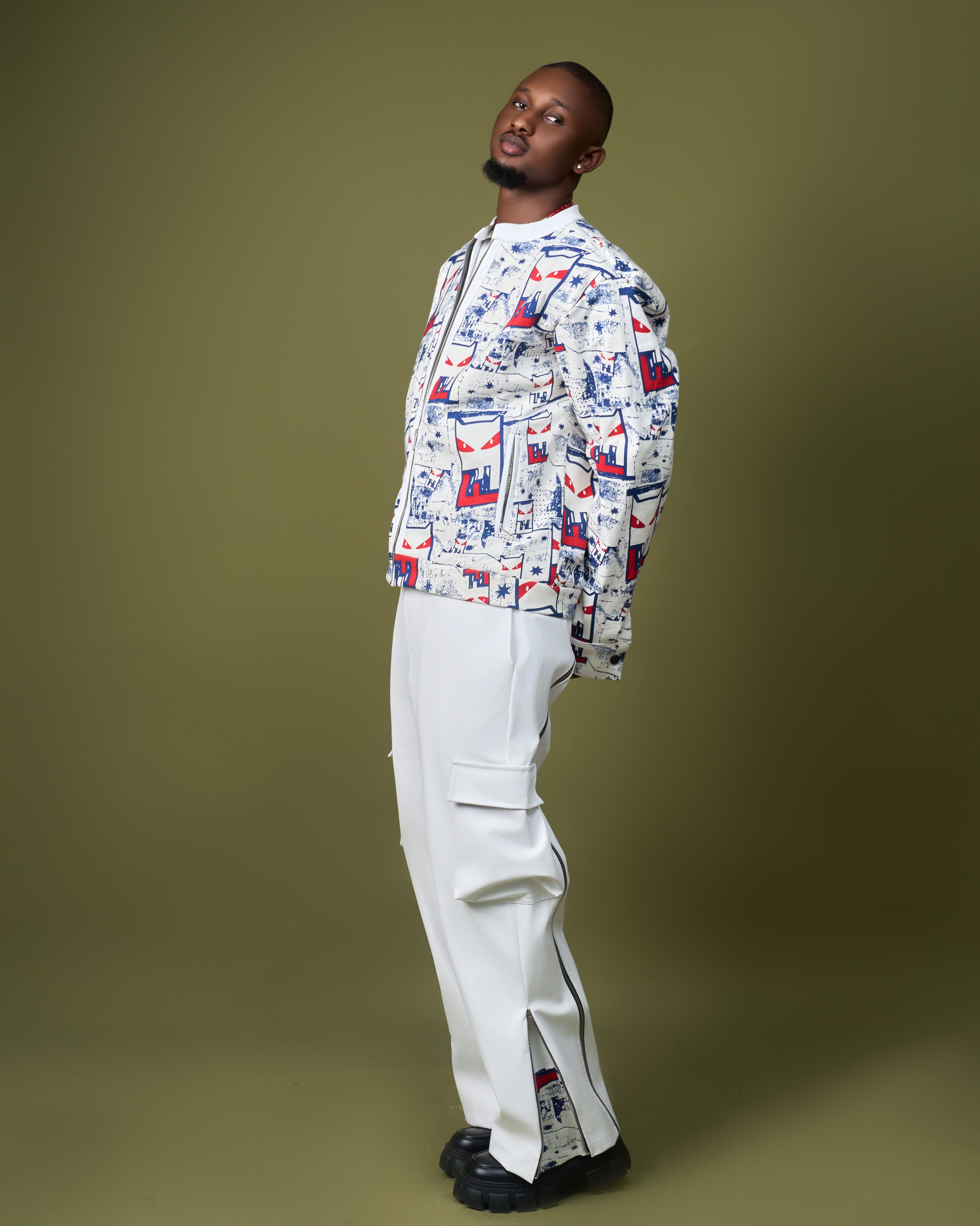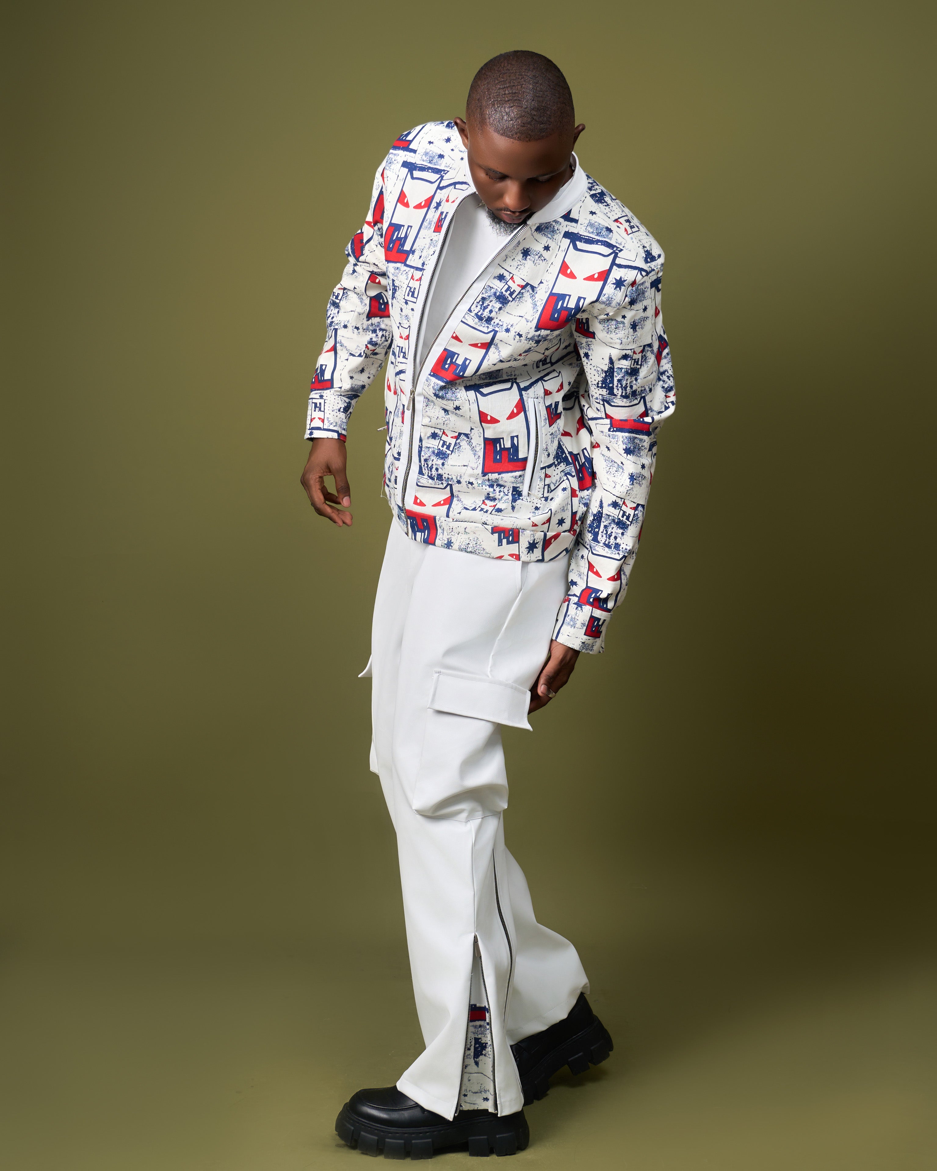 Bomber zippé à motif graphique rouge et bleu, associé à un pantalon cargo blanc aux détails zippés sur les chevilles. Un look audacieux et plein de caractère.