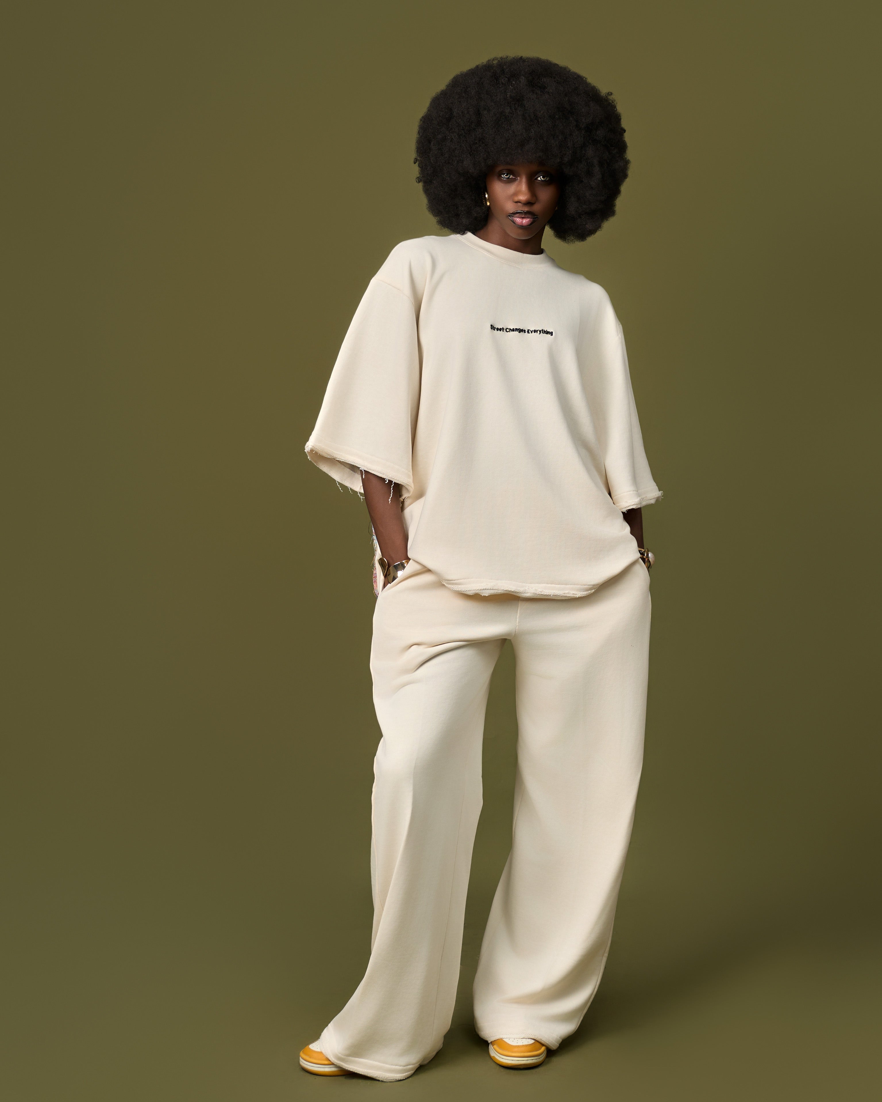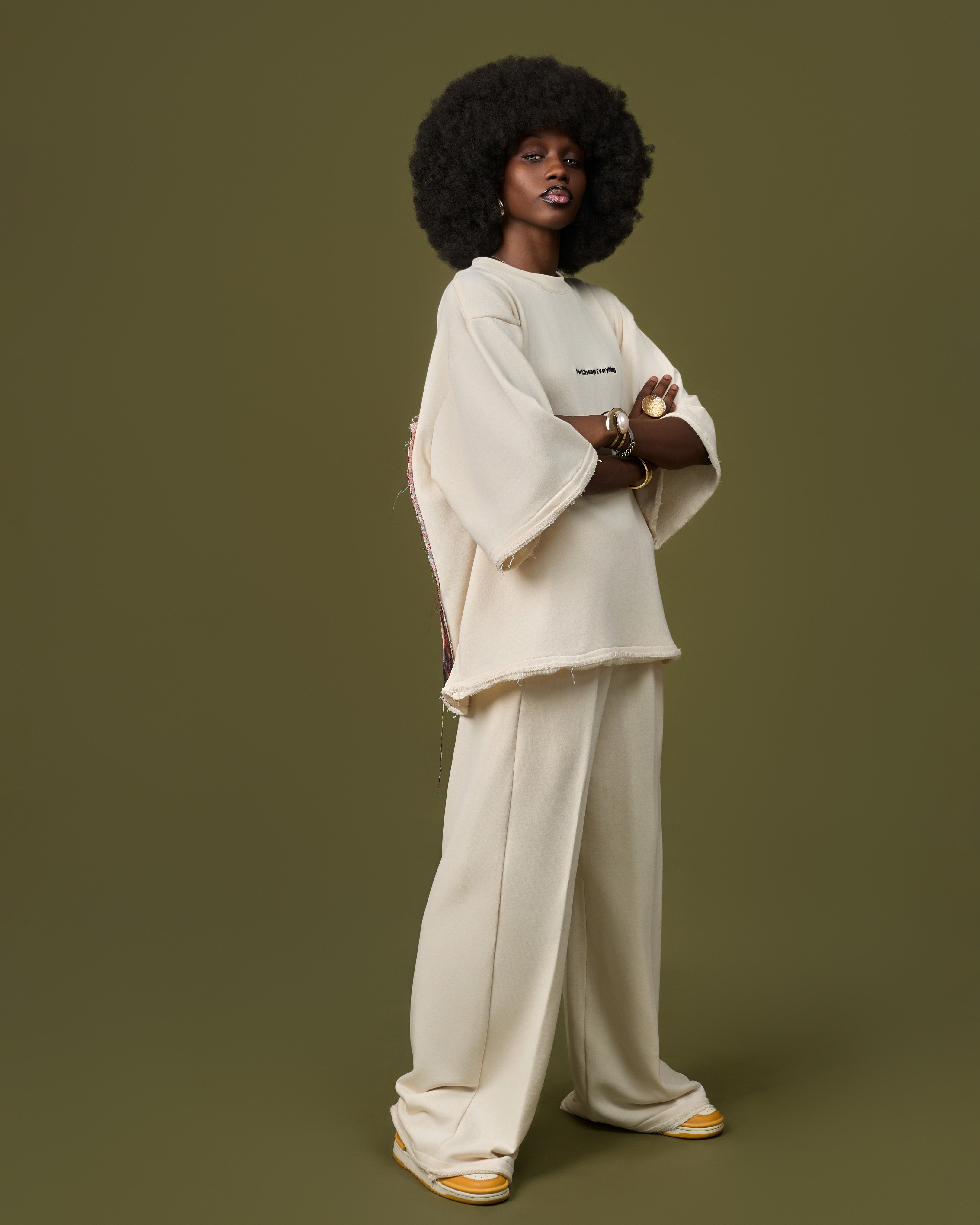 Ensemble sweat oversize et pantalon large couleur. La pièce maîtresse :   un imprimé artistique captivant au dos et sur la jambe. Confort décontracté et affirmation culturelle.