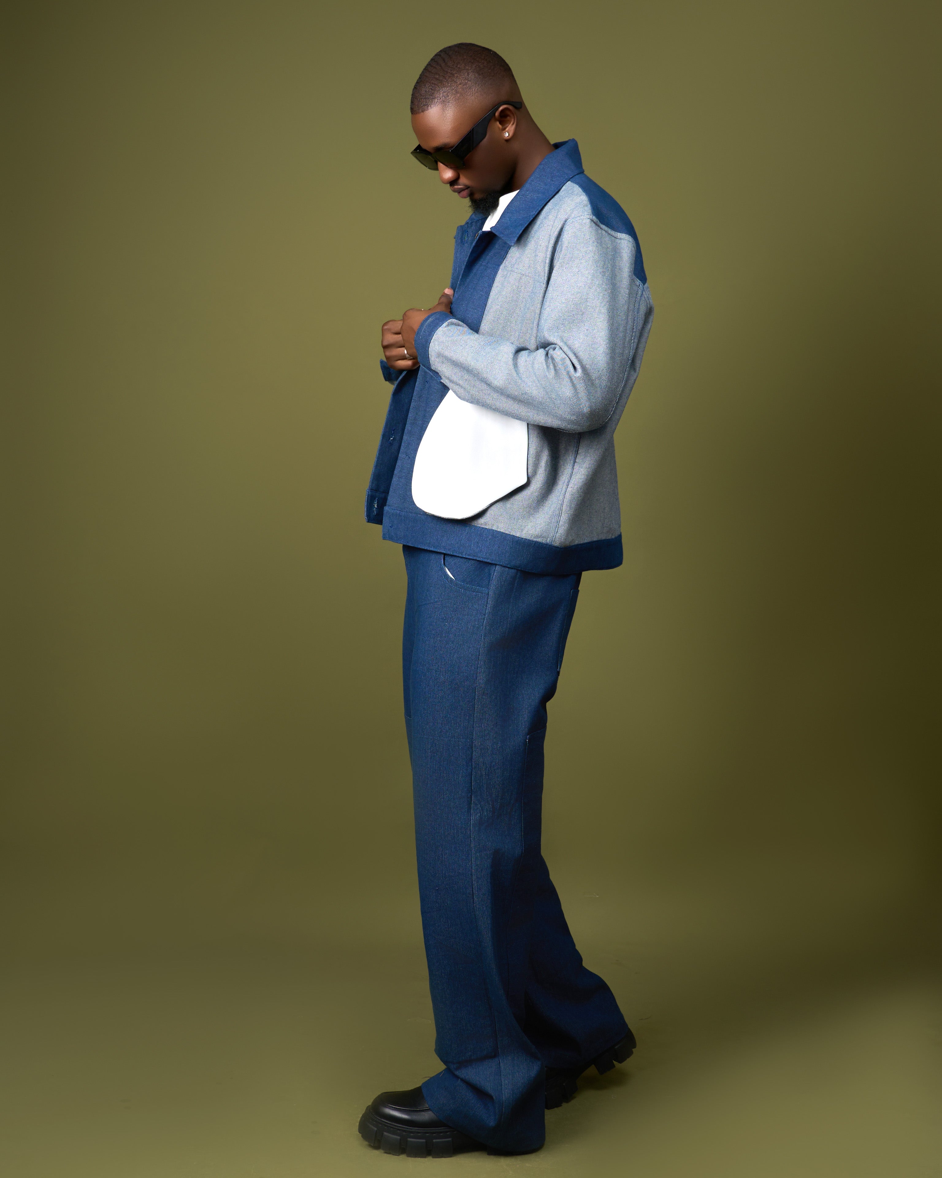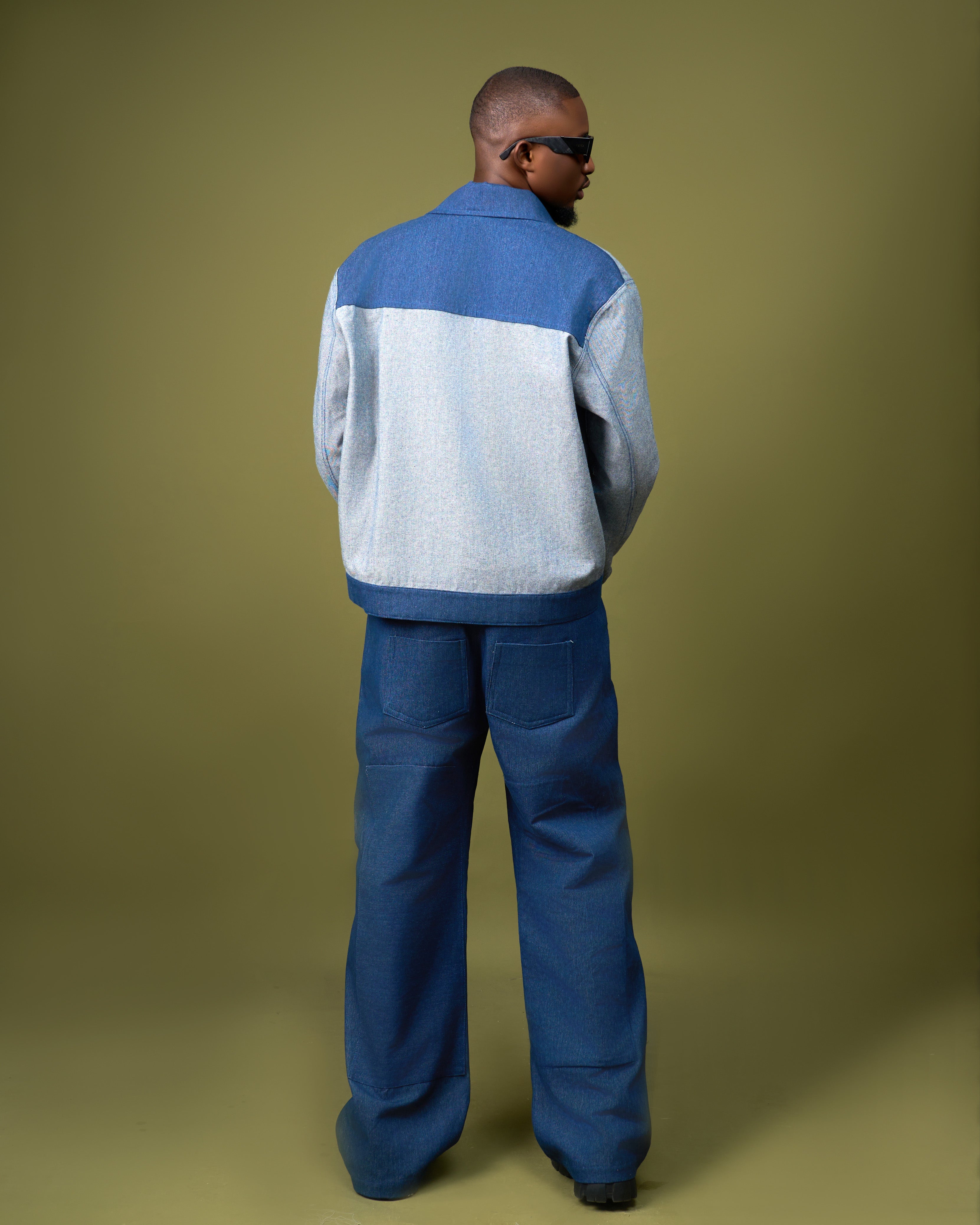 Veste et pantalon assortis en Jean gris et bleu, décorés de détails blancs contrastants. Une tenue confortable au style avant-gardiste.