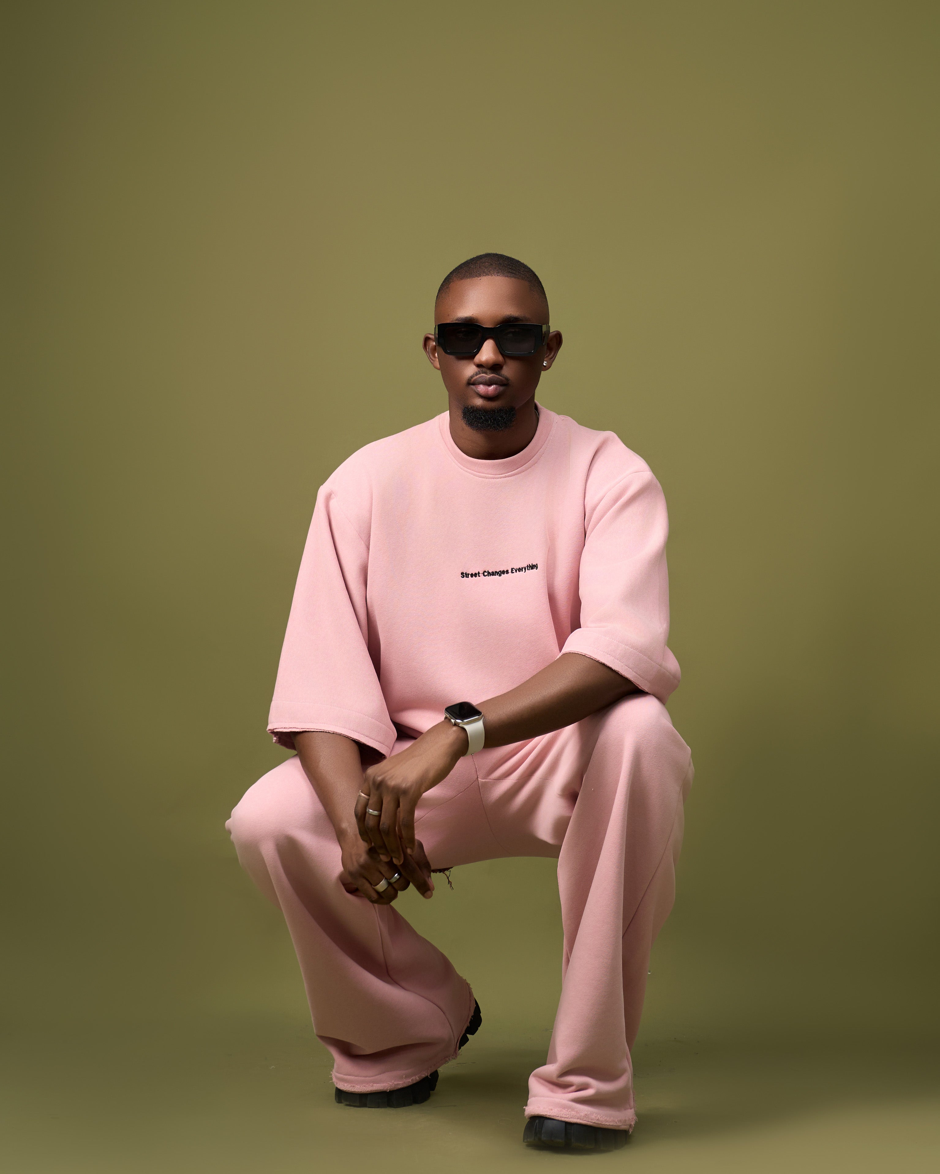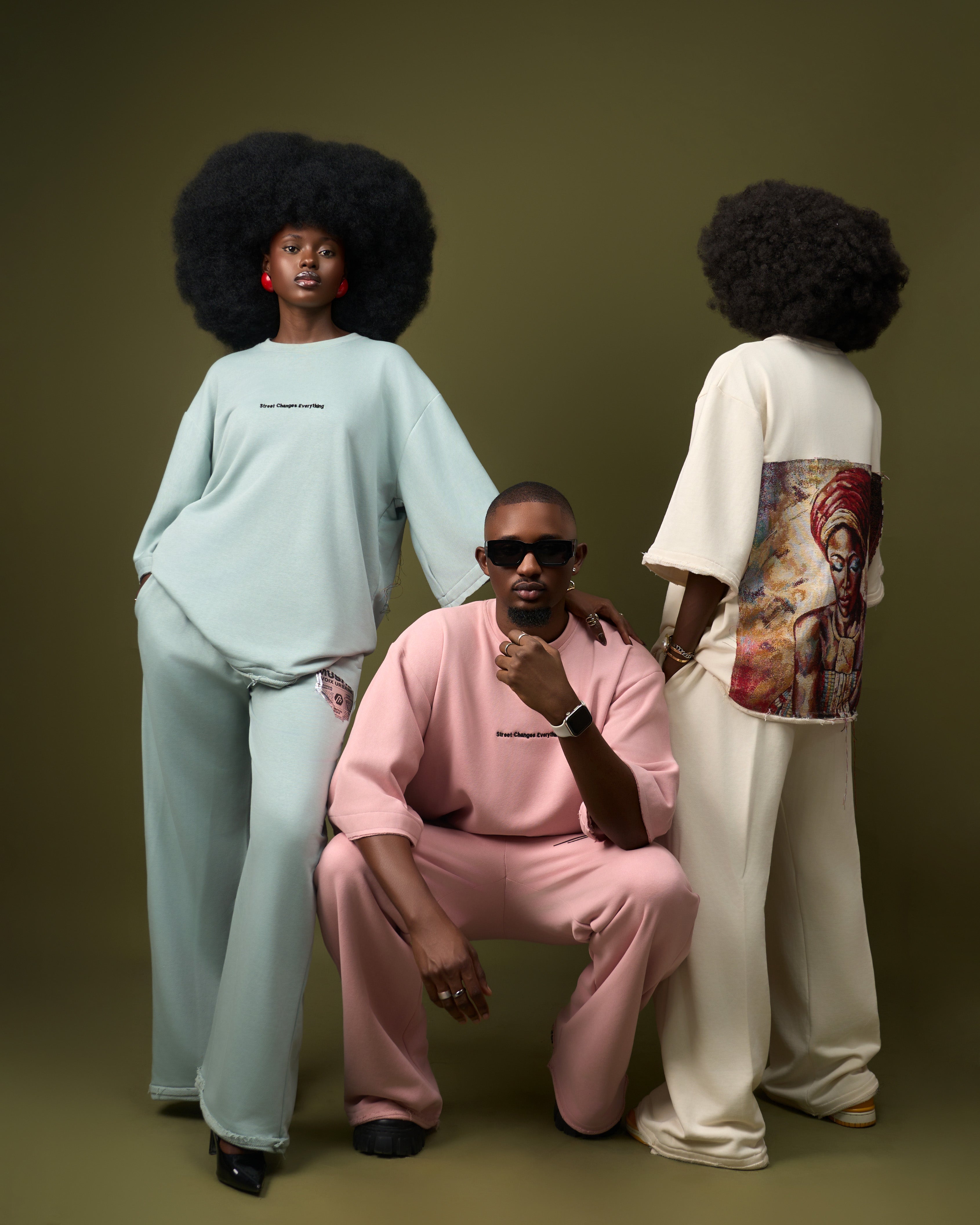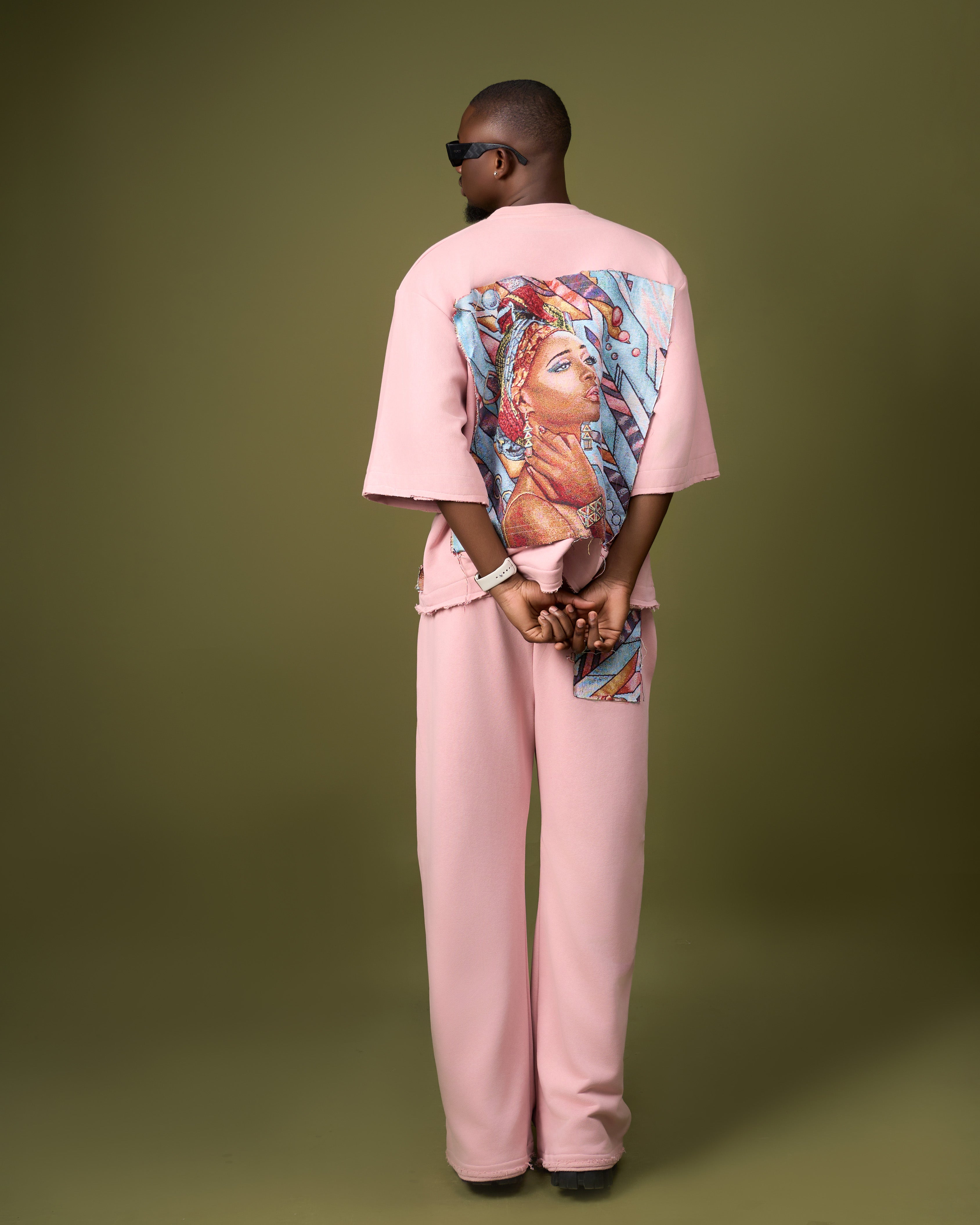 Ensemble sweat oversize et pantalon large couleur. La pièce maîtresse :   un imprimé artistique captivant au dos et sur la jambe. Confort décontracté et affirmation culturelle.