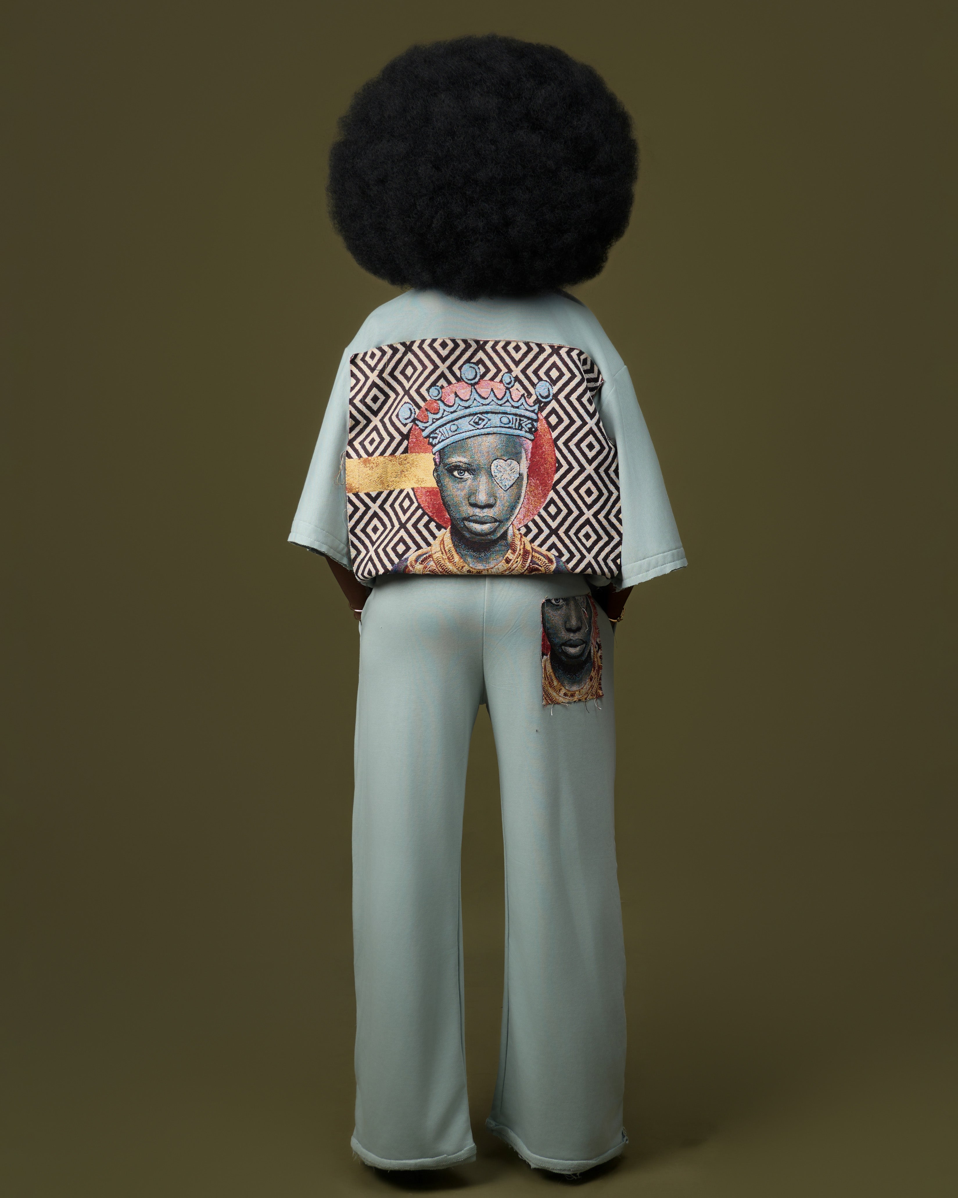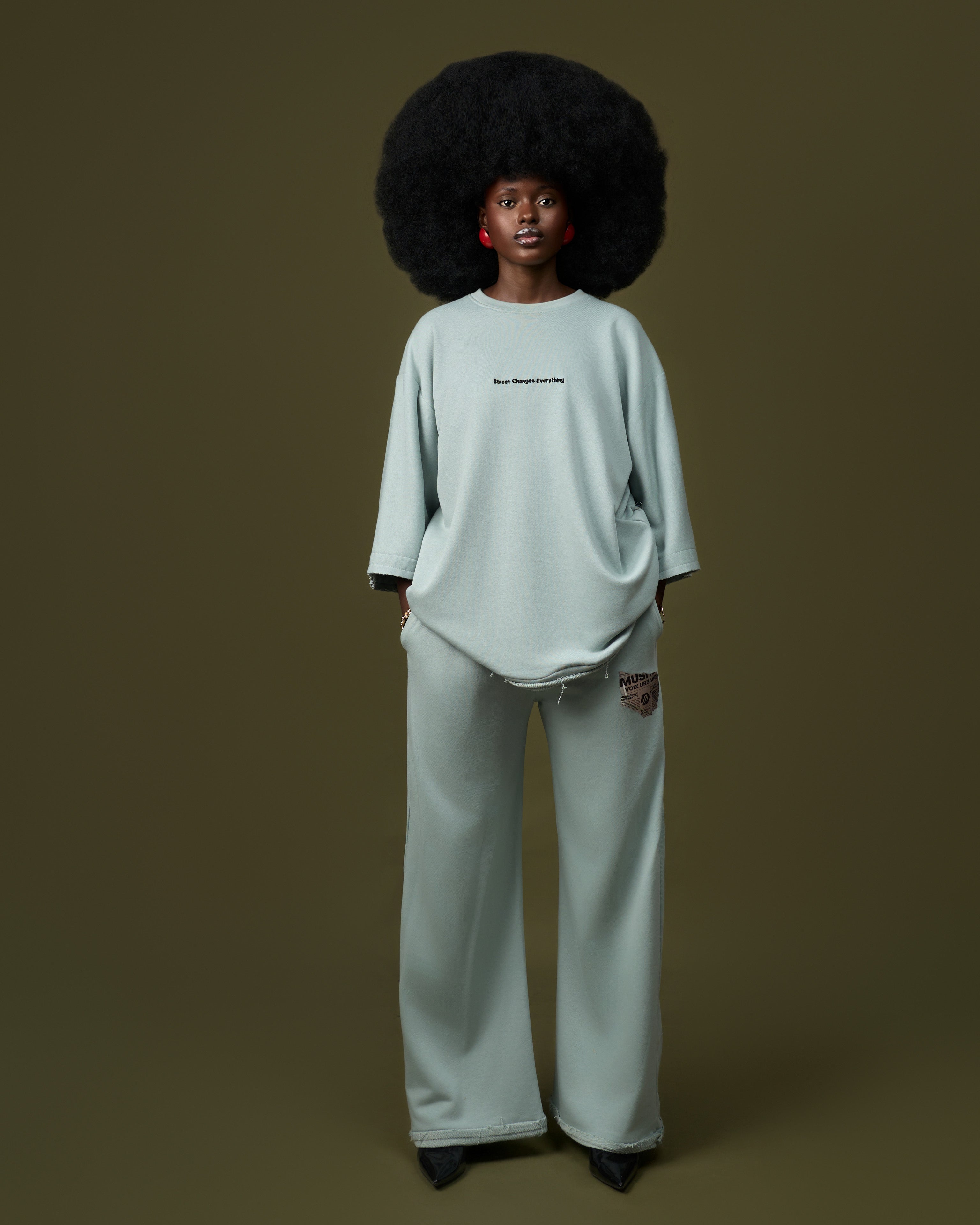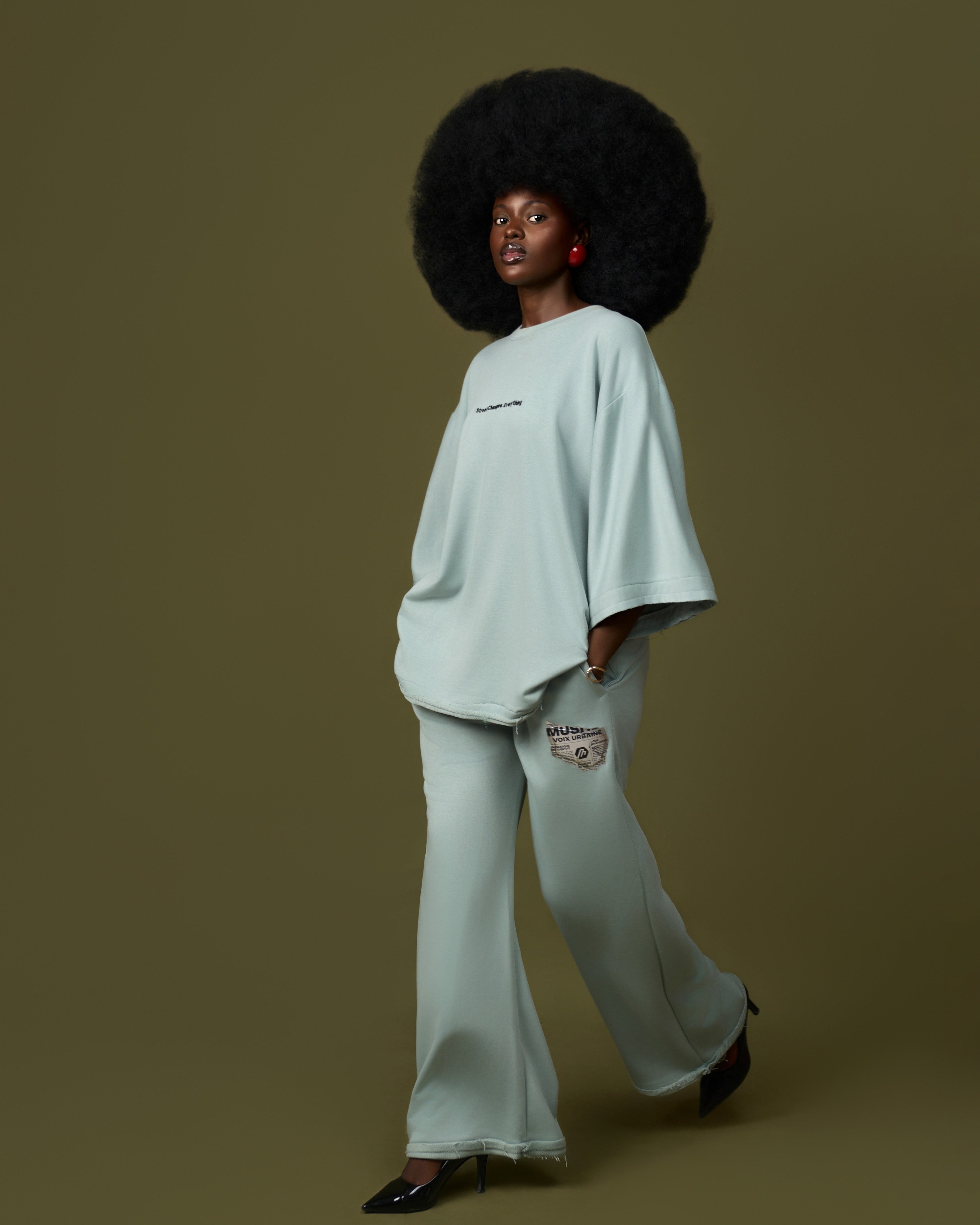 Ensemble sweat oversize et pantalon large couleur. La pièce maîtresse :   un imprimé artistique captivant au dos et sur la jambe. Confort décontracté et affirmation culturelle.