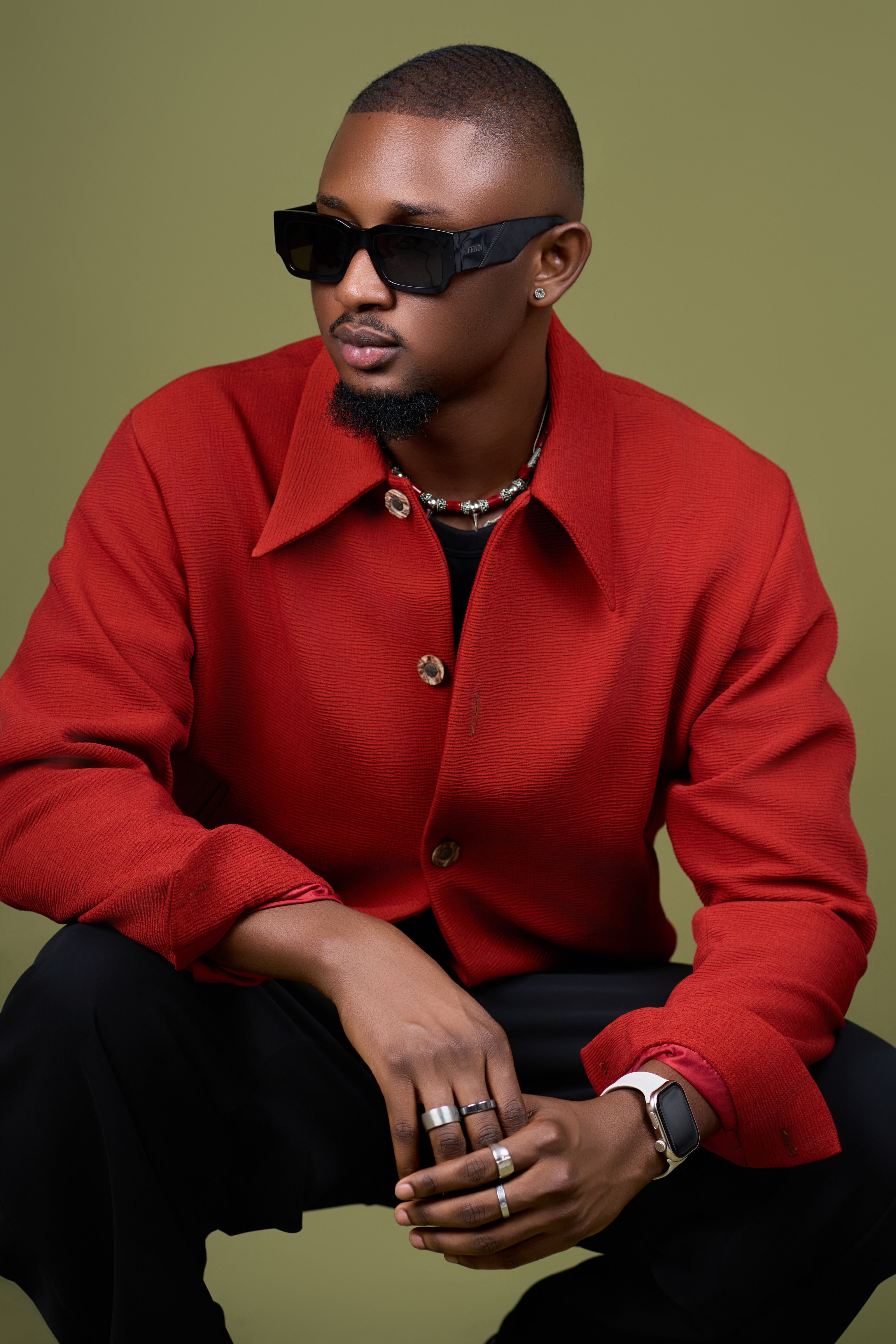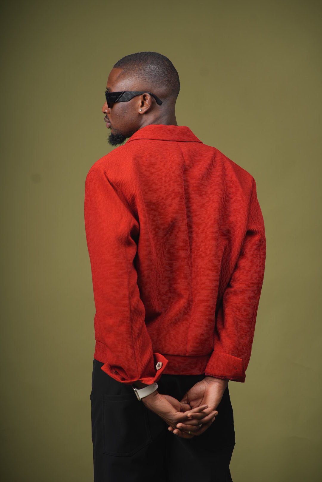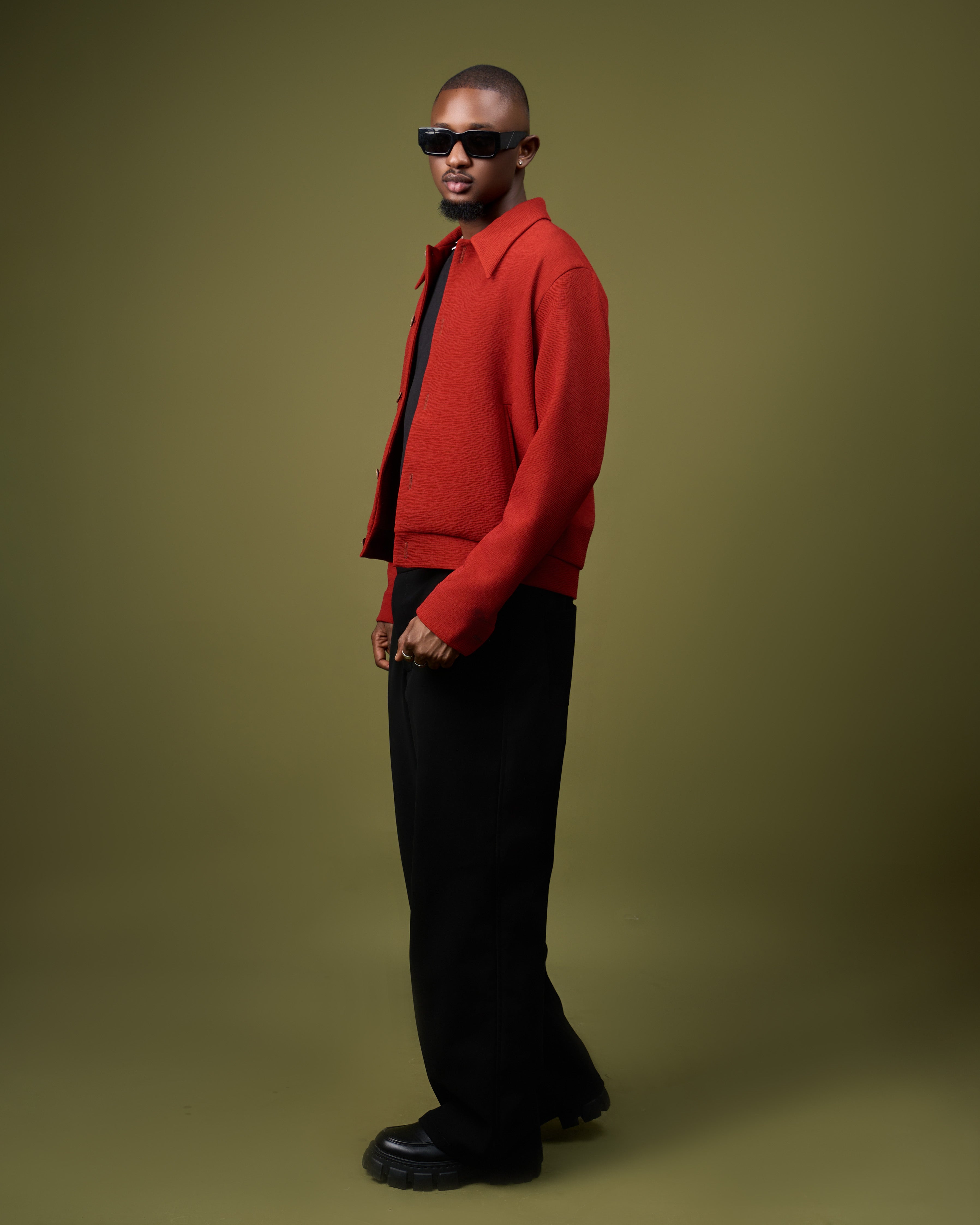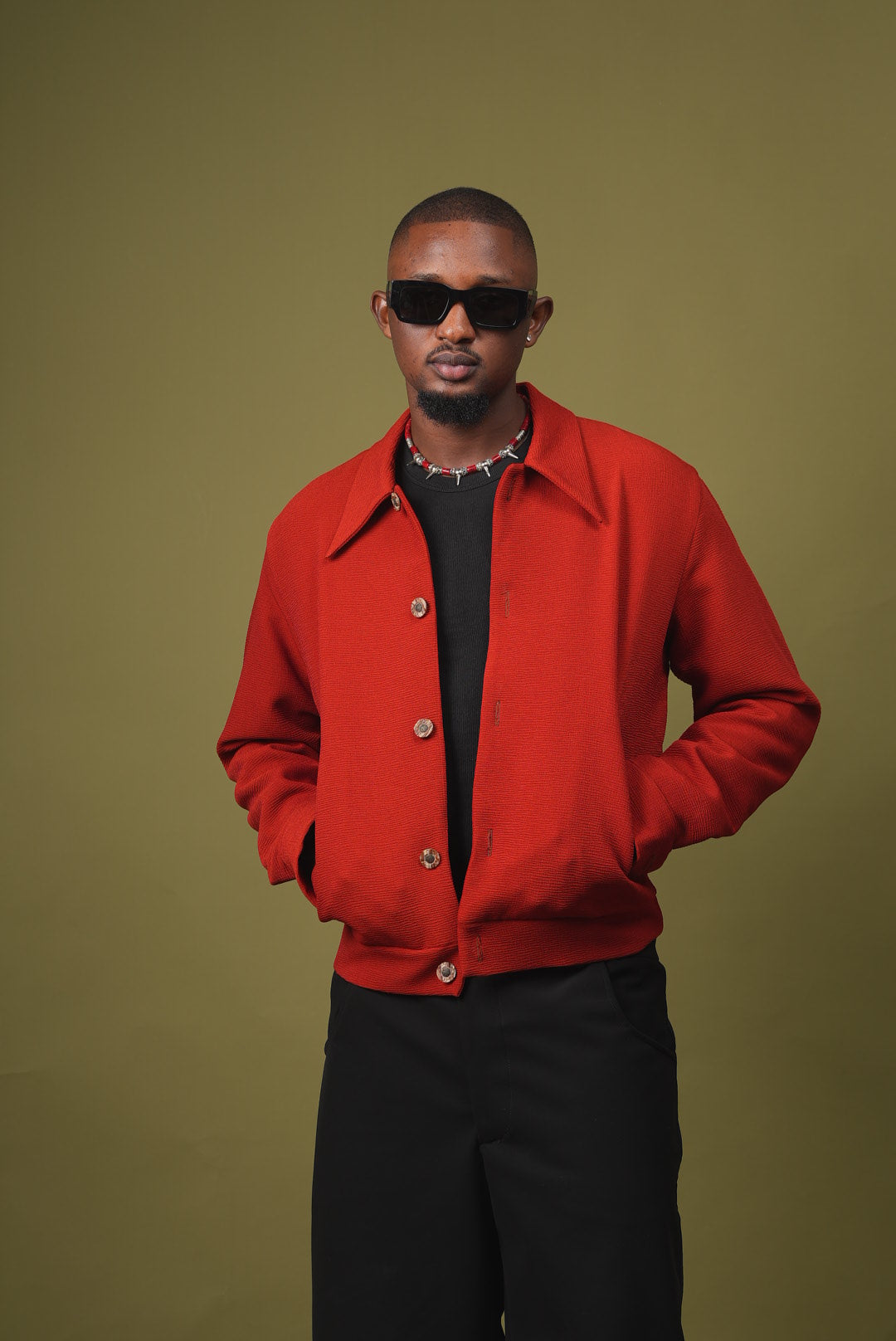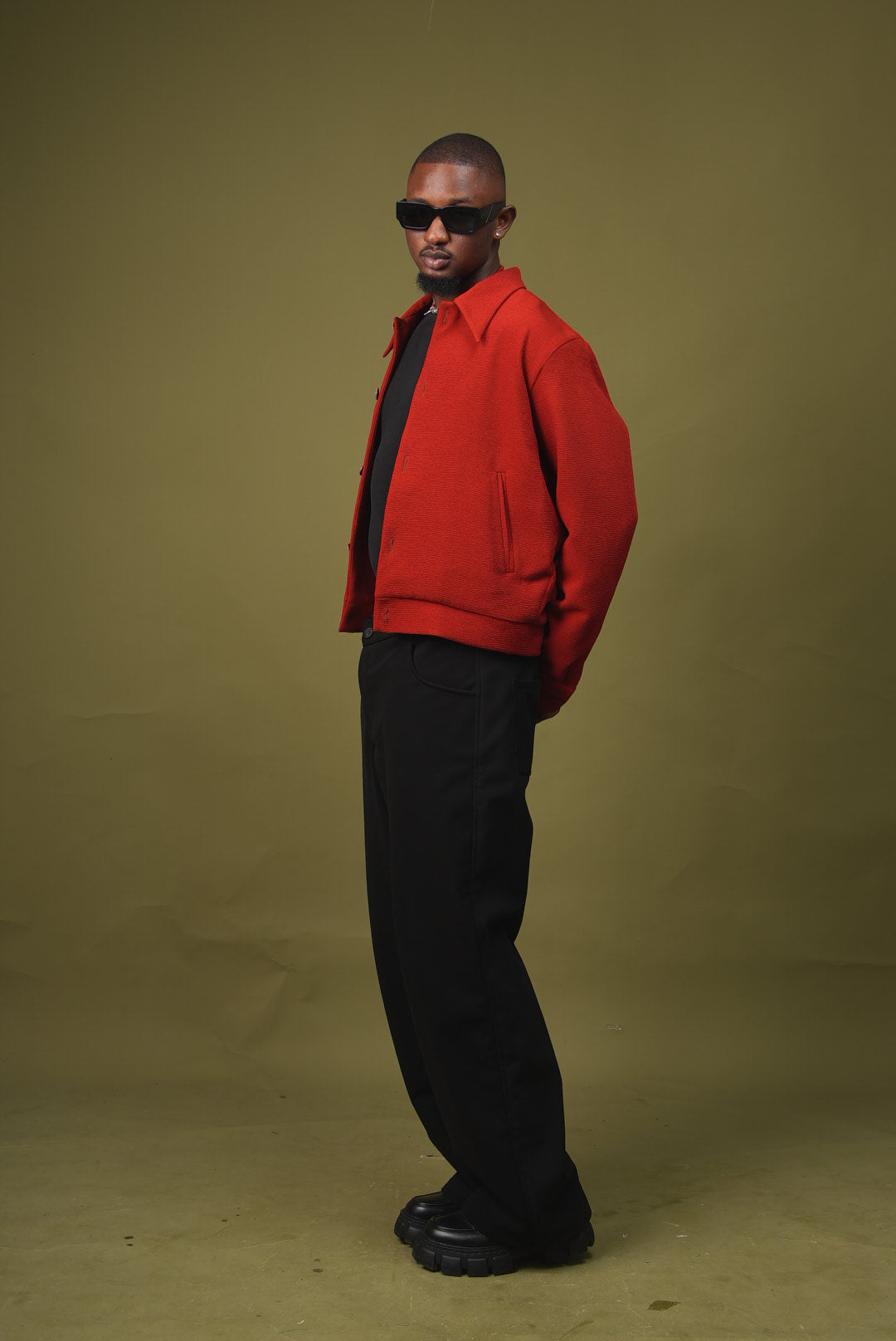 Veste texturée rouge brique à col chemise et coupe courte. Elle est associée à un pantalon noir ample. Une pièce forte et chaleureuse qui structure la silhouette avec une touche moderne.